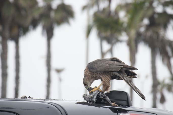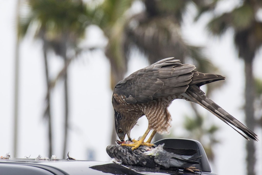 Did a trip through SoCal in Sept 2021 from Newport Beach, Huntington Beach, Seal Beach, Malibu, SLO, Santa Barbara, to Monterey. In the parking lot to Balboa Pier in Newport Beach these three guys were looking at this pickup truck and I couldn’t figure out why. As I got closer I realized they were watching a Cooper’s Hawk eat a pigeon. I haven’t shot many wildlife images in my life, it’s not really my thing, but with my M6II and the 55-200mm shooting freehand I nailed some shots. The last domain of cameras is telephoto and macro images since phone cameras don’t do either well at this point, but I’m sure that will change by 2030. The iPhone telephoto lens is a 52mm FF equivalent whereas my 55-200 is a 88-320mm FF equivalent. Luckily I had my 55-200 on me. The main thing I was worried about is that I would spook the hawk and he would fly away with his prey. I was careful not to get too close, but my 200mm only filled the frame so much so I had to get closer to get the shots below. Luckily he stayed put and just kept eating his prey. He carefully spit out the feathers and he worked to decapitate his prey.